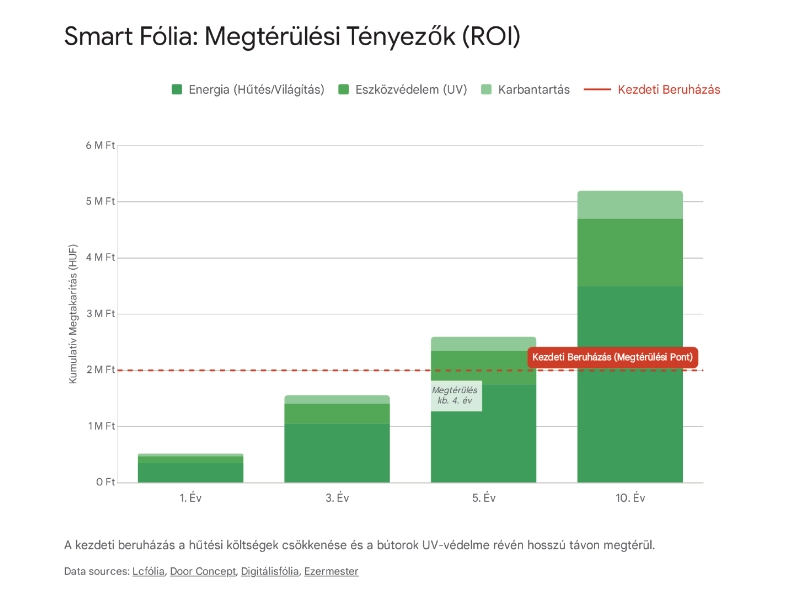 Smart foil is not only spectacular, it also makes money. Blocks 99% of UV radiation and a significant proportion of infrared (heat) radiation 2, drastically reducing the load on the air conditioner in summer. As the figure below shows, the initial investment pays off in the long run through reduced cooling costs and UV protection of the furniture. Its consumption is negligible: only 5-7 watts per m² (in transparent mode only), which is less than the consumption of a single LED bulb.