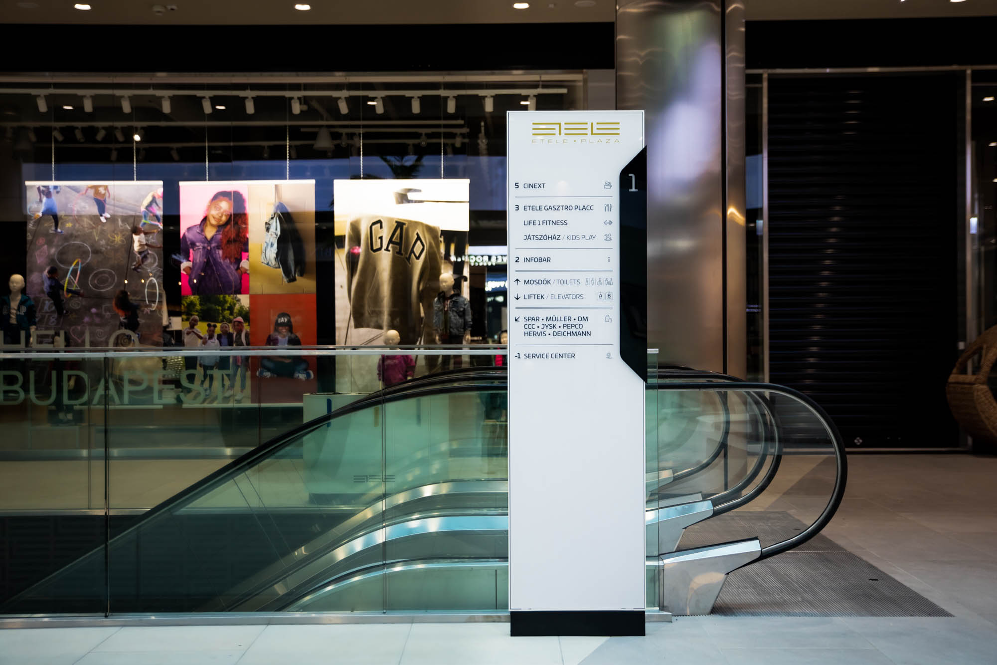 - Eszközök: Totemek, digitális információs kioszkok, recepciós háttérfalak.