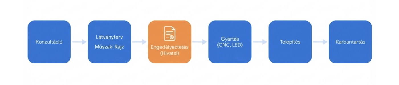 Az átláthatóság nálunk alapelv. Az alábbi folyamatábra bemutatja, hogyan jutunk el az első skicctől a kész, világító reklámig: